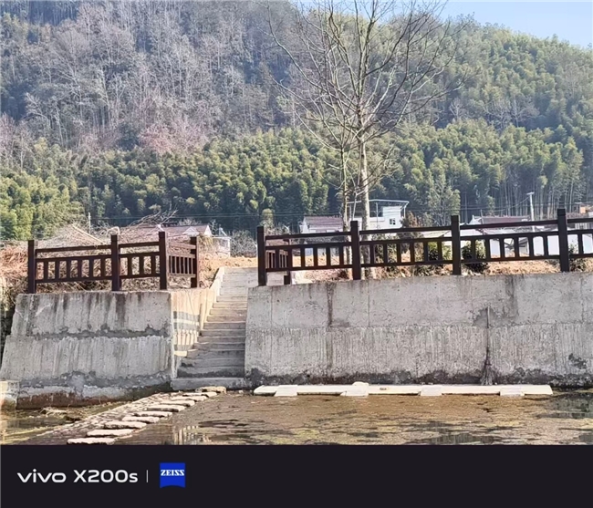 (图为驾雾村河岸防护工程全景,木质围栏与混凝土护岸结合)